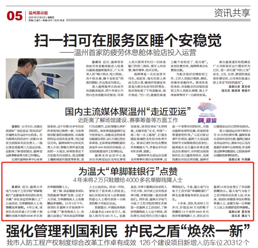 4 年来,团队先后将 2 万多只、价值近 80 万元的鞋子捐赠给 13 个省的 4000 多名贫困单脚残障人士,团队还与温州13家企业签订了样品鞋捐赠协议。温大球盟会相关负责人说,在未来,该团队将继续寻找和帮助单脚人士,志愿为每一位单脚人士送上免费舒适的单脚鞋。