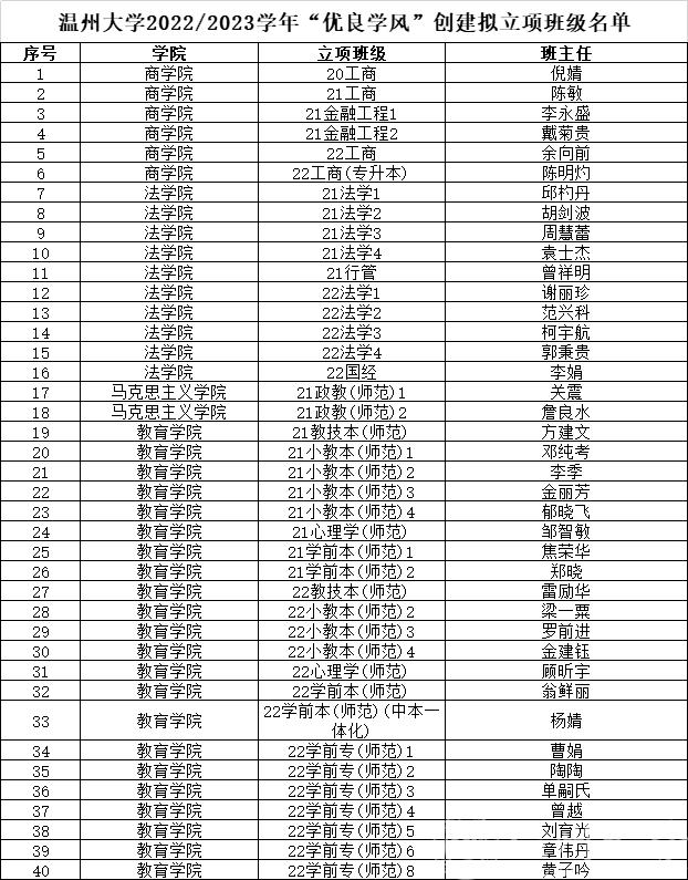 根据《关于申报2022/2023学年“优良学风班”立项活动的通知》,经班级申报、学院初审推荐、员工处审核,决定对20工商等146个班级进行立项,现将结果予以公布。
