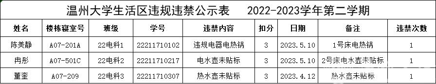 自2022-2023学年第二学期入学开始,学校针对宿舍安全每周进行大排查。根据学校第十二周寝室安全卫生检查结果,排查到2位同学存在寝室违规现象,受到学校通报;同时排查第十周寝室安全检查有1位同学存在寝室违规。现根据学校相关规定,对上述3位同学进行院内通报批评,请其他同学引以为戒(名单见下)。