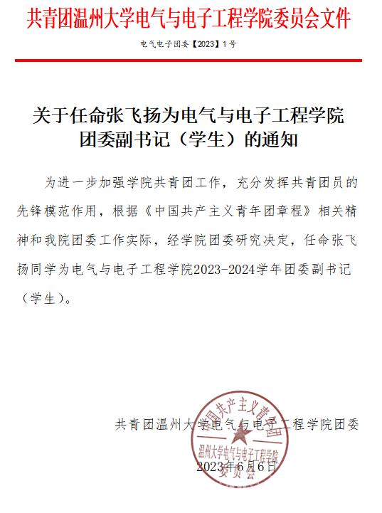 关于任命张飞扬为球盟会团委副书记(员工)的通知