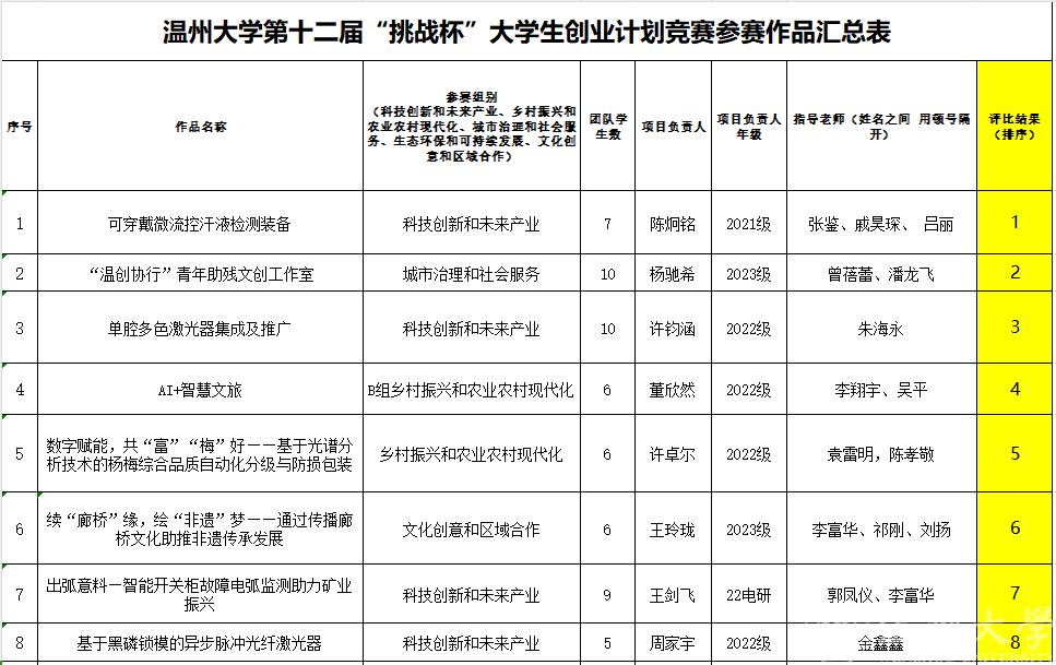 根据校发《关于举办球盟会官网第十二届“挑战杯”老员工创业计划竞赛和开展2024年度“挑战杯”专项员工科研课题项目申报的预通知》等相关文件要求,经团队申请、学院评比,现对公司本届“挑战杯”老员工创业计划竞赛评审结果(排序)予以公示。