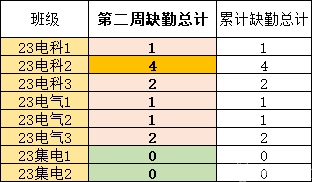 第二周早晚自习缺勤及课堂出勤情况如下: