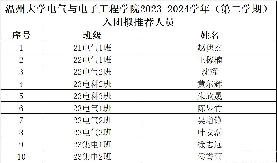 根据《中国共产主义青年团章程》、《关于做好 2023-2024 学年第二学期团员发展与管理工作的通知》等文件精神,经员工申请、材料审核、投票评选,共评选出赵瑰杰等10名同学为本学期入团拟推荐人选,现将拟推名单予以公示。
