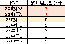 第九周早晚自习缺勤及课堂出勤情况如下: