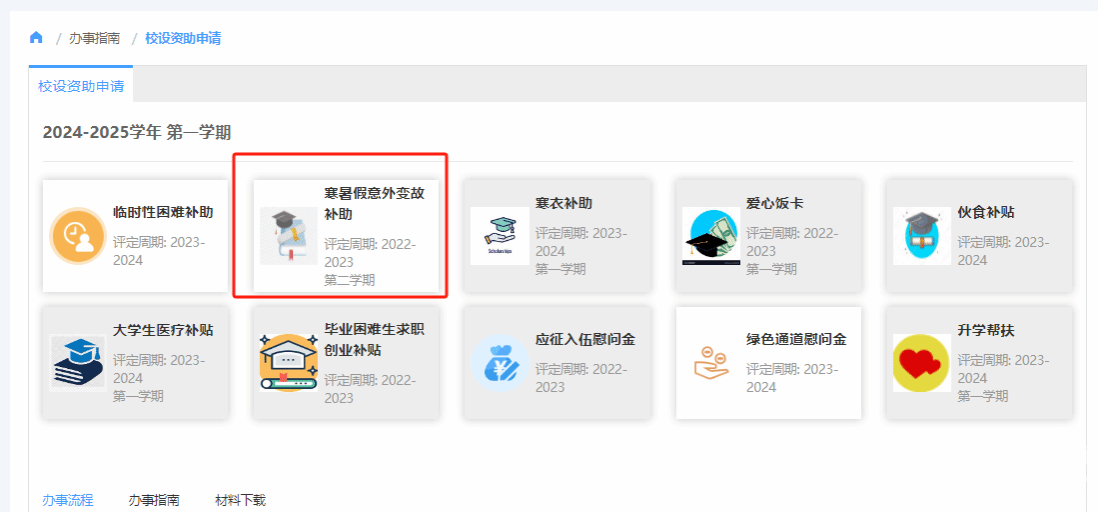 1.“暑期意外变故补助”仅限在今年(2024年)暑假期间发生的意外变故申请。员工申请步骤:员工登陆学工系统-服务大厅-校设资助申请-选择“寒暑假意外变故补助”-填写申请金额、理由、本人的中国工商银行卡卡号并上传相关支撑材料的照片-提交-学院审核-学工部审核。