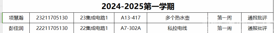 自2024-2025学年第一学期入学开始,学校针对宿舍安全进行大排查。根据学校第一周寝室安全卫生检查结果,第一周排查到4位同学存在寝室违规现象,其中2位同学屡次被查到宿舍违规,受到学校通报;现根据学校相关规定,对上述同学进行院内通报批评,请其他同学引以为戒(名单见下)