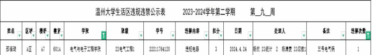 自2023-2024学年第二学期入学开始,学校针对宿舍安全进行大排查。根据学校第九周寝室安全卫生检查结果,第九周排查到1位同学存在寝室违规现象,受到学校通报;现根据学校相关规定,对上述同学进行院内通报批评,请其他同学引以为戒(名单见下)