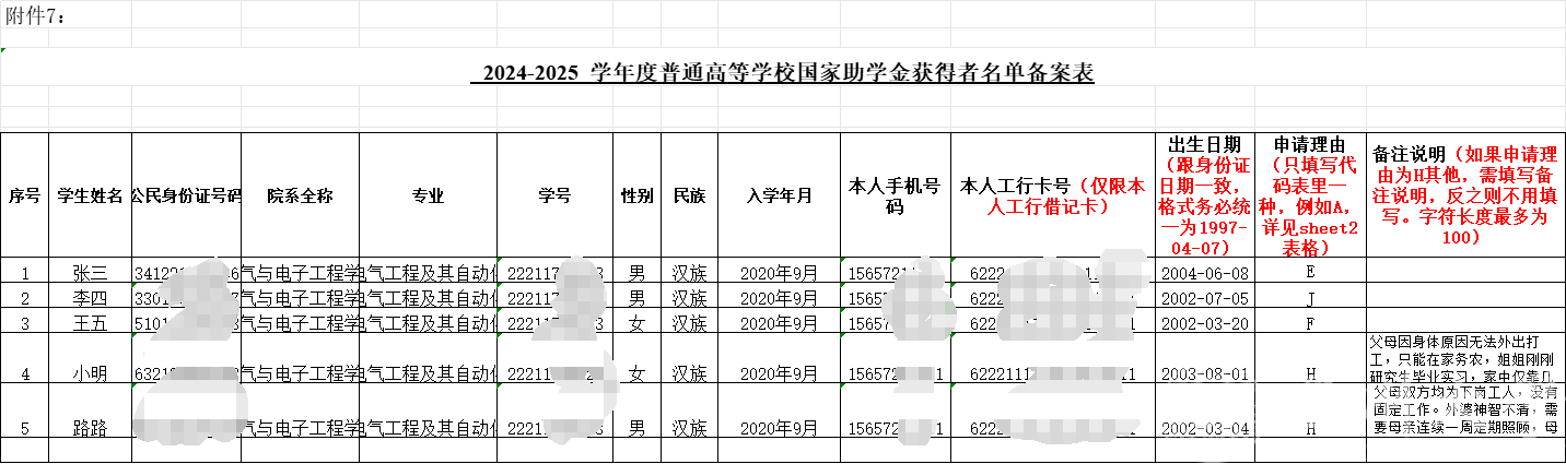 1.电子材料-①国家助学金申请表附件6:2024-2025学年本专科生国家助学金申请表(日期都不填).doc(按照样表规范填写,申请表日期处都空着不填,调整到一页);②国家助学金备案表附件7:2024-2025学年国家助学金获得者名单备案表.xls
