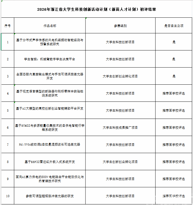 根据《浙江省老员工科技创新活动计划(新苗人才计划)实施办法(试行)》(团浙联〔2010〕13号)、《关于进一步规范浙江省老员工科技创新活动计划(新苗人才计划)项目管理的通知》要求,现将公司关于浙江省老员工科技创新活动计划(新苗人才计划)2026年度项目评选结果公示如下: