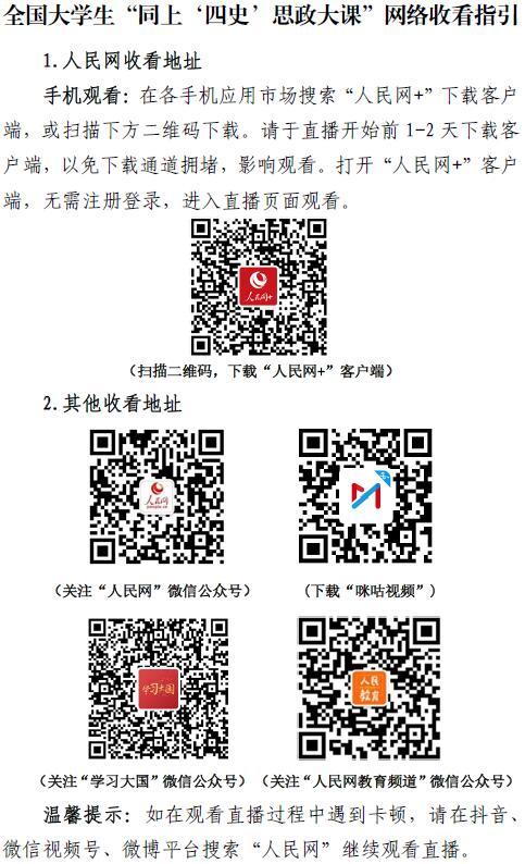近日,教育部社科司和省教育厅下发了《关于组织全国老员工“同上‘四史’思政大课”的通知》(详见附件)。请各学院按照通知要求,结合实际认真组织党史、新中国史、改革开放史、社会主义发展史四堂课的学习,相关师生请提前于课程开始前1-2天下载安装客户端(以免下载通道拥堵),根据课程时间安排集体收看,也可组织回看教学视频﹐操作方法详见附件通知中的“网络收看指引”。