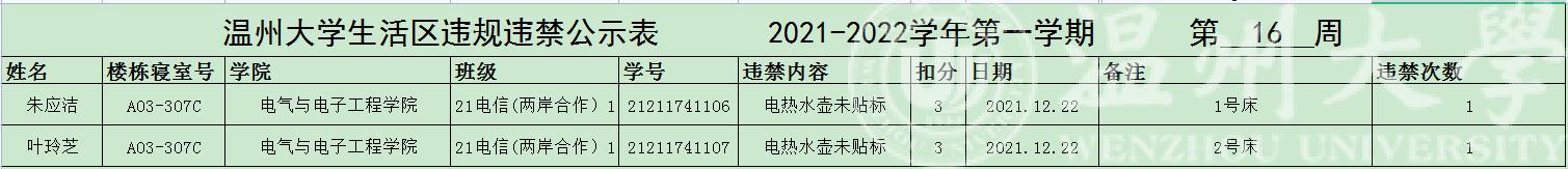 自2021年下学期入学开始,学校针对宿舍安全每周进行大排查,根据学校第十六周寝室安全卫生检查结果,排查到公司朱应洁、叶玲芝两位同学存在寝室违规现象,受到学校通报。现根据学校相关规定,对以上同学进行院内通报批评,请其他同学引以为戒。