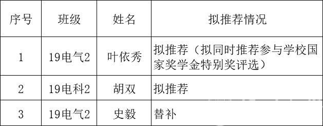 其中叶依秀同时推荐参与学校国家奖学金特别奖评选。若该同学当选,则不占学校名额,学院会再有一名额,按照得票数高低,将递补史毅同学。现将2021-2022学年球盟会国家奖学金拟推荐名单予以公示。