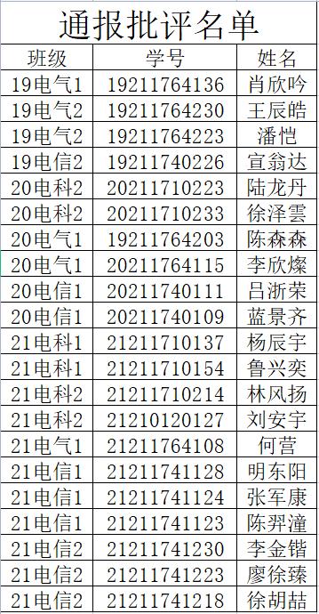根据学校排查、学院学工办核实,有以下同学没有遵守温州市和公司疫情防控要求:核酸检测间隔时长超72小时。根据《球盟会官网新冠肺炎疫情防控期间员工纪律处分暂行规定》,结合学院实际,给予以下同学全院通报批评。
